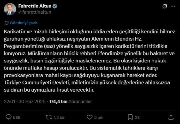 Cumhurbaşkanlığı İletişim Başkanı Fahrettin Altun, "Karikatür ve mizah dergisi olduğunu iddia eden birtakım kendini bilmez güruhun yönettiği ahlaksız neşriyatın, Alemlerin Efendisi Hazreti Peygamberimize yönelik saygısızlık içeren karikatürlerini şiddetle kınıyoruz. Türkiye Cumhuriyeti Devleti, milletimizin yüksek değerlerine ahlaksızca saldıran bu aymazlara fırsat vermeyecektir" dedi