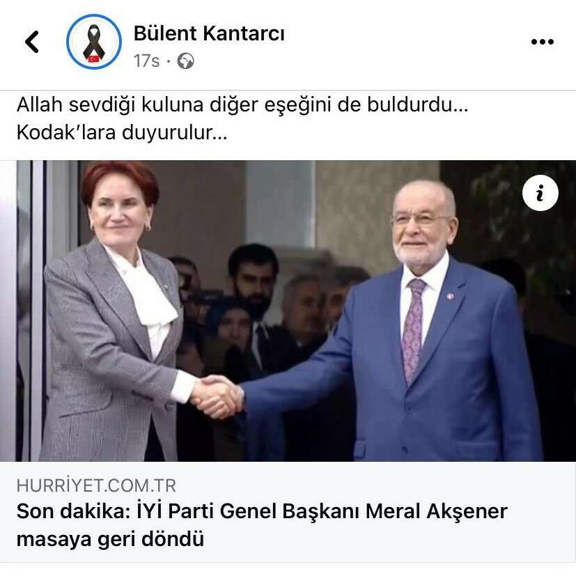 CHP'lı Çaycuma Belediye Başkanı Bülent Kantarcı, Çaycumaspor için önceki günlerde yaptığı paylaşımda "Allah sevdiği kuluna eşeğini kaybettirir sonra da buldururmuş" benzetmesi yaptı. Çaycumaspor ile ilgili tartışmalar devam ederken Kantarcı bu kez de aynı benzetmeyi 6'lı masadan kalktıktan bir süre sonra geri dönen Meral Akşener için de yaptı. Kantarcı, "Allah sevdiği kuluna diğer eşeğini de buldurur" paylaşımının ardından bazı İYİ Parti üyeleri duruma tepki gösterdi.