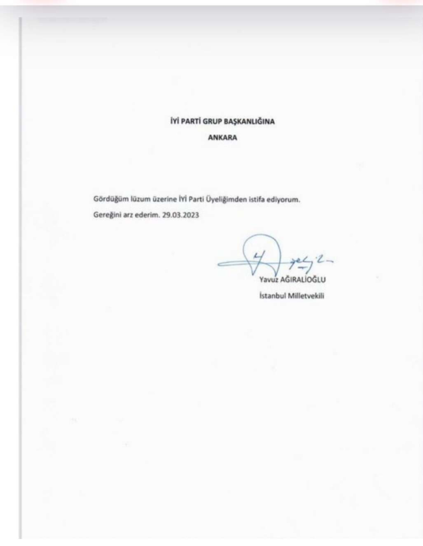 Ağıralioğlu istifa dilekçesinde tek cümle kullandı. "Gördüğüm lüzum üzerine İyi Parti Üyeliğimden istifa ediyorum."