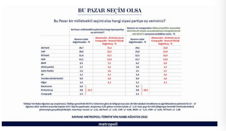 MetroPOLL Araştırma Türkiye’nin Nabzı Ağustos 2022 anketinin sonuçlarını yayımladı. 11-16 Temmuz tarihlerini kapsayan araştırmaya göre AK Parti ile CHP arasında 10 puana yakın fark var.