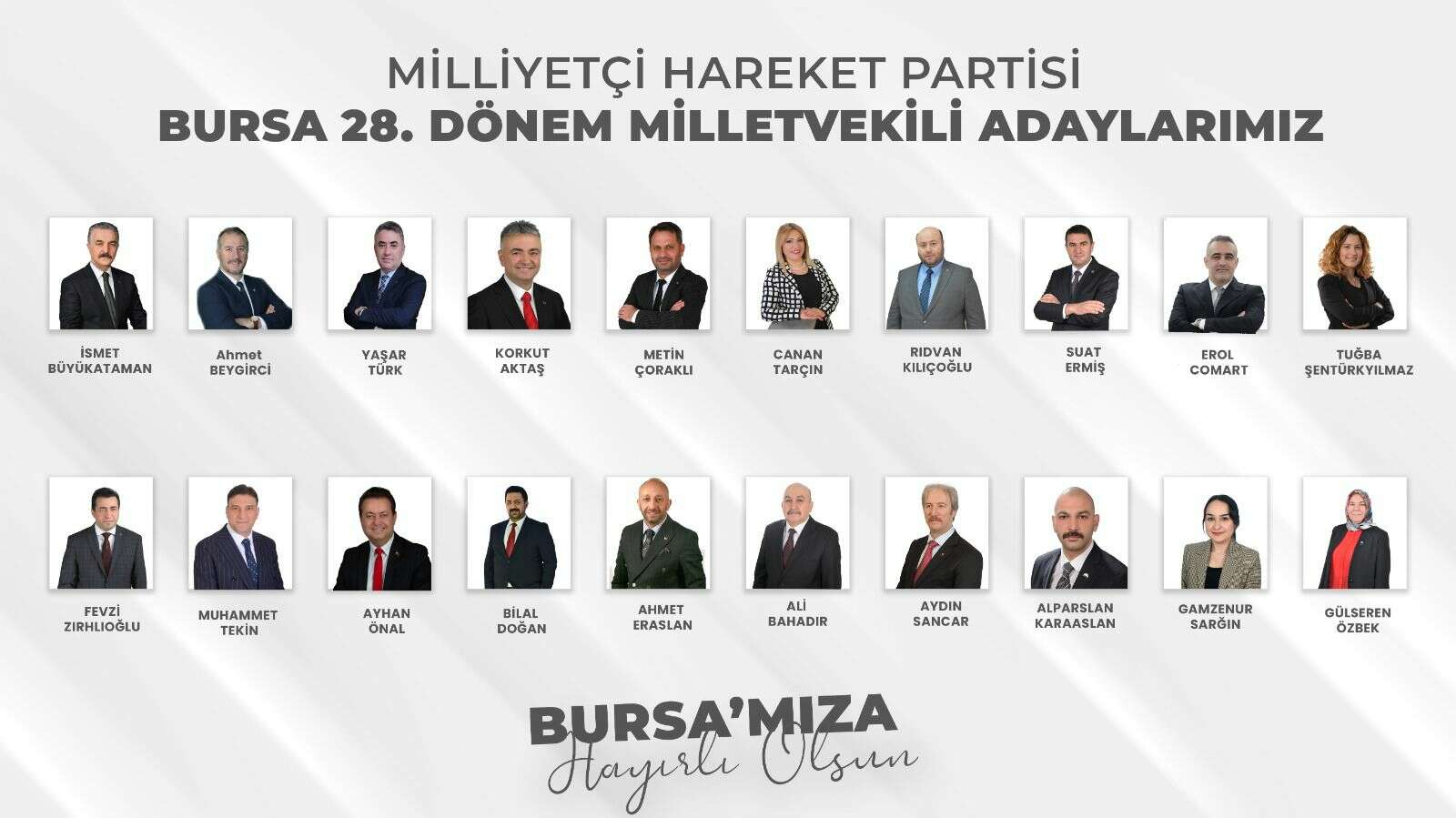 Milliyetçi Hareket Partisi (MHP) Bursa İl Başkanlığı, 28’inci Dönem Milletvekili Aday Tanıtım toplantısı düzenledi. Programda konuşan MHP Genel Sekreteri ve Bursa Milletvekili İsmet Büyükataman, “14 Mayıs’ta Türk milleti ‘Her Şeyden Önce Türkiye’ diyecek ve Cumhur İttifakı’nın zaferi ile Yeni Yüzyılda Güçlü Devleti Hep Birlikte Kuracağız” ifadelerini kullandı.