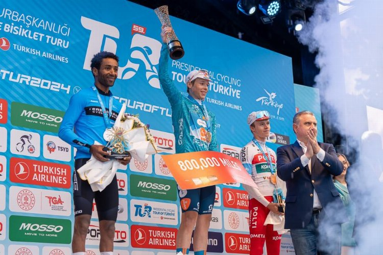 59. Cumhurbaşkanlığı Türkiye Bisiklet Turu'nu zirvede tamamlayarak genel klasman birincisi olan Dsm-Firmenich PostNL takımının Hollandalı sporcusu Frank van den Broek aynı zamanda turkuaz mayonun da sahibi oldu.