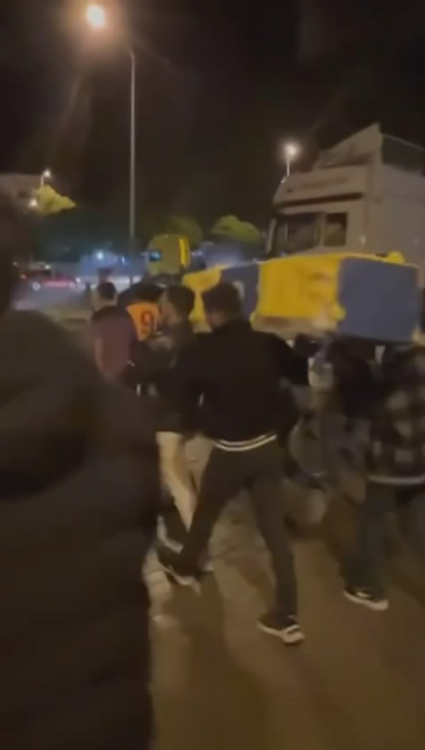 Bursa'da dün gece şampiyonluk sonrası bir grup Galatasaray taraftarı, Fenerbahçe bayrağı ile örtülmüş boş tabut taşıdı. O anlar saniye saniye kameraya yansıdı.