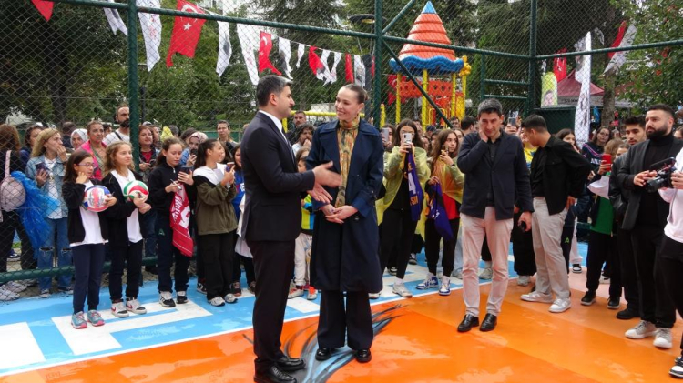 Kurdele kesiminin ardından Eda Erdem ve Başkan Adıgüzel, parkta bulunan voleybol sahasını gezdi.