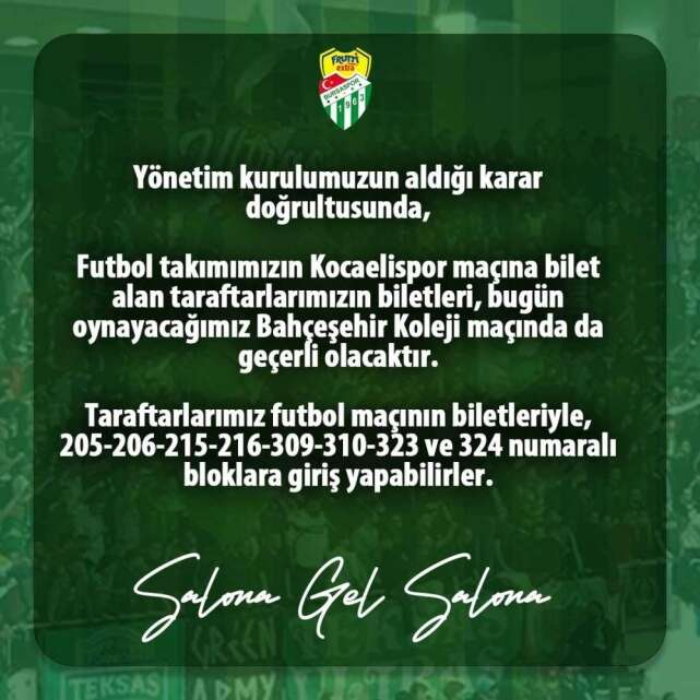 Frutti Extra Bursaspor’dan yapılan açıklama şu şekilde: “Futbol takımımızın Kocaelispor maçına bilet alan taraftarlarımızın biletleri, bugün oynayacağımız Bahçeşehir Koleji maçında da geçerli olacaktır. Taraftarlarımız futbol maçının biletleriyle, 205-206-215-216-309-310-323 ve 324 numaralı bloklara giriş yapabilirler.”