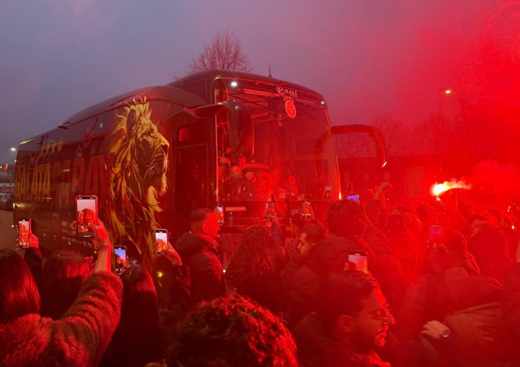 Otobüsle otele giden Galatasaray'ı taraftarlar, meşaleler yakarak ve pankartlar açarak büyük bir coşku ile karşıladı.