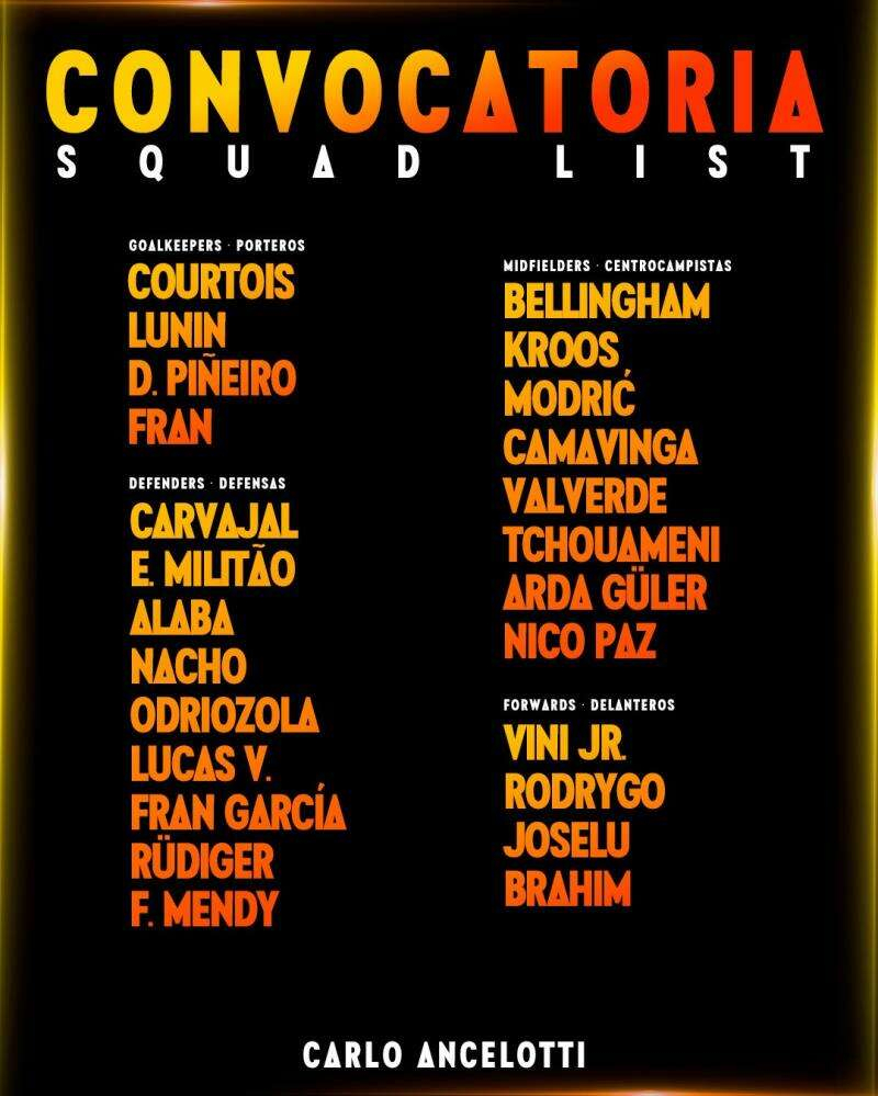 "Courtois, Lunin, Diego Pineiro, Fran, Carvajal, Militao, Alaba, Nacho, Odriozola, Lucas Vazquez, Fran Garcia, Rüdiger, Mendy, Bellingham, Kroos, Modric, Camavinga, Valverde, Tchouameni, Arda Güler, Nico Paz, Vini Jr, Rodrygo, Joselu ve Brahim Diaz"