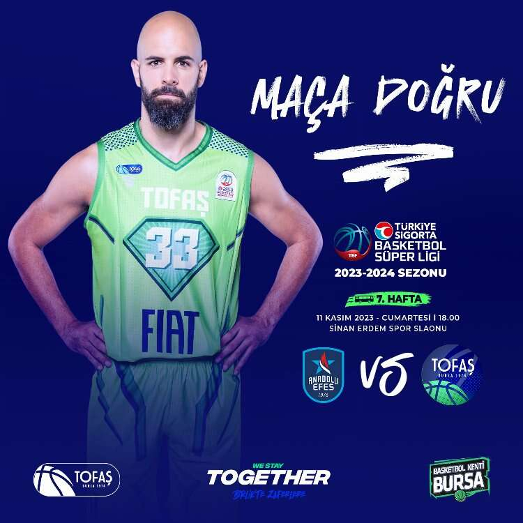 Türkiye Sigorta Basketbol Süper Ligi 7. haftasında TOFAŞ, deplasmanda Anadolu Efes’e konuk oluyor. Ligde geride kalan 6 haftada 2 galibiyet-4 mağlubiyet alan Mavi Yeşilliler, İstanbul deplasmanında kazanarak çıkışa geçmenin planlarını yaparken, Bursa ekibinde bu maç öncesi eksik oyuncu bulunmuyor. Ligde 5 galibiyet-1 yenilgisi bulunan ve Fenerbahçe Beko ile birlikte zirveyi paylaşan Erdem Can yönetimindeki Anadolu Efes, 9 Kasım Perşembe günü oynadığı Euroleague karşılaşmasında sahasında Zalgiris Kaunas’ı 86-82 mağlup etmişti.