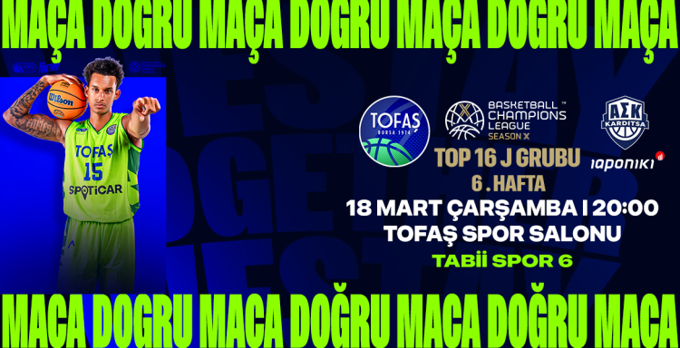 TOFAŞ Basketbol Takımı, Basketbol Şampiyonlar Ligi TOP 16 turu J Grubu 6. hafta karşılaşmasında Yunanistan temsilcisi Karditsa laponiki’yi konuk ediyor. 18 Mart Çarşamba günü TOFAŞ Spor Salonu’nda oynanacak maç saat 20.00’de başlayacak ve Tabii Spor 6’dan canlı yayınlanacak.
