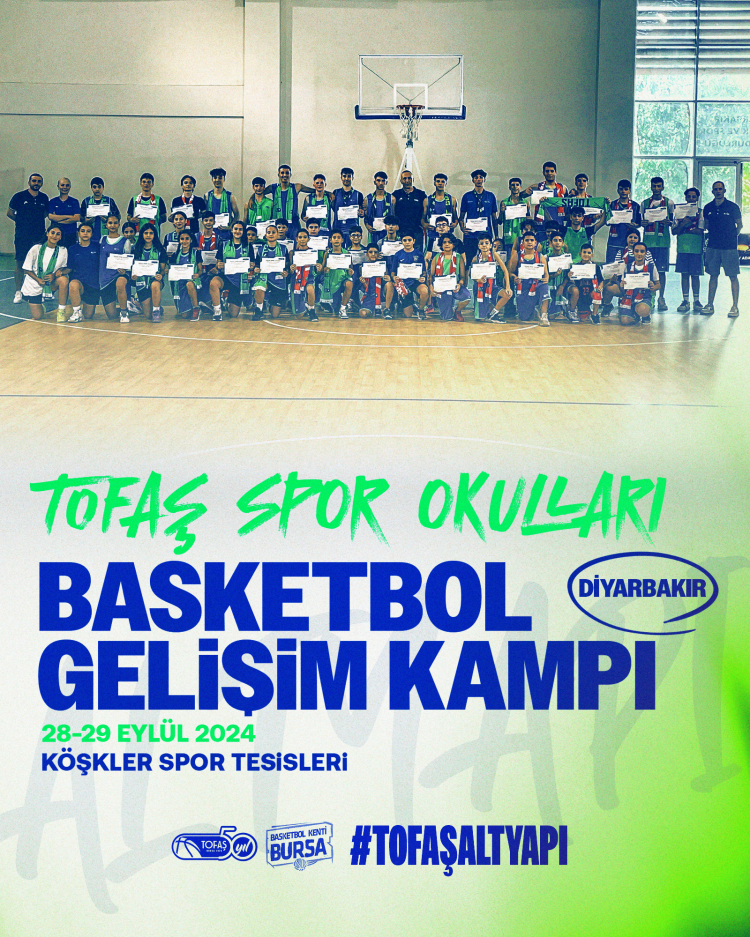 TOFAŞ Spor Kulübü, altyapısından yetiştirdiği oyuncularla Türk basketboluna katkı sunmaya ve gençlere basketbol sevgisini aşılamaya devam ediyor. Kulübün Türkiye genelinde yürüttüğü spor okulu projelerinden biri olan Diyarbakır TOFAŞ Spor Okulu öğrencileri, 28-29 Eylül 2024 tarihlerinde düzenlenen TOFAŞ Spor Okulları Basketbol Gelişim Kampı’nda bir araya gelerek yeteneklerini geliştirdi.