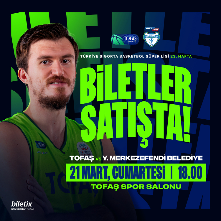 TOFAŞ Basketbol Takımı’nın Türkiye Sigorta Basketbol Süper Ligi 23. haftasında evinde Yukatel Merkezefendi Belediyesi ile oynayacağı mücadelenin biletleri satışa çıktı. Mavi Yeşilliler, taraftarının desteğiyle evindeki bu maçtan galibiyetle ayrılmayı hedeflerken; 21 Mart Cumartesi günü saat 18.00’de başlayacak karşılaşmanın biletlerinin satışı biletix.com’dan (online satış) ve Biletix perakende satış noktalarından başladı. Maç günü salon bilet gişesi saat 11.00’den itibaren açık olacak.