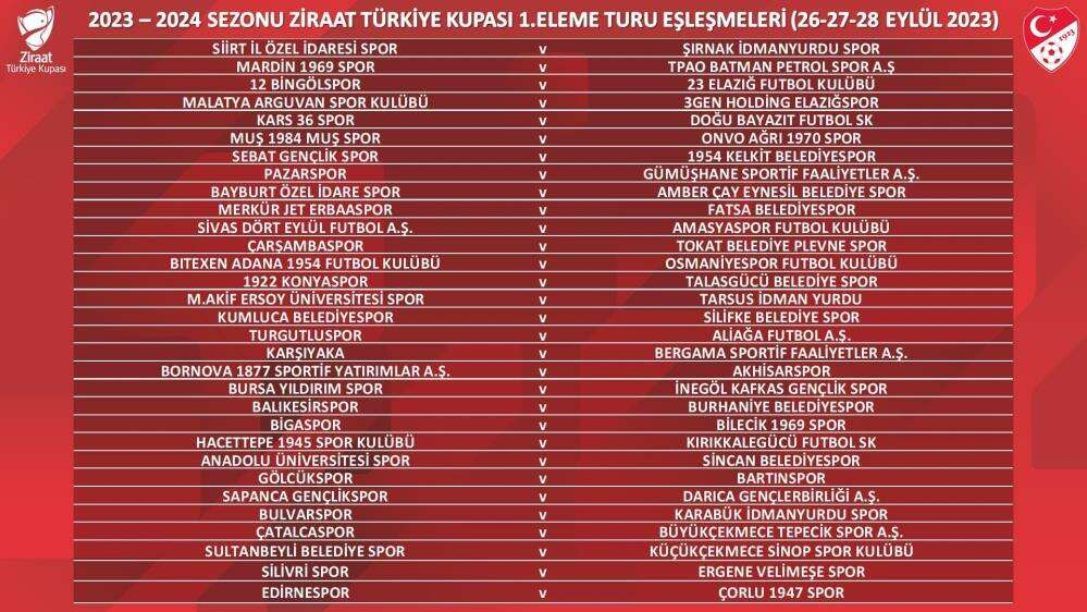 Ziraat Türkiye Kupası 1. Eleme Turu eşleşmeleri belli oldu. 62 takımın mücadele edeceği ve tek maç eleminasyon sistemine göre yapılacak 1. Eleme Turu karşılaşmaları 26, 27 ve 28 Eylül tarihlerinde oynanacak.