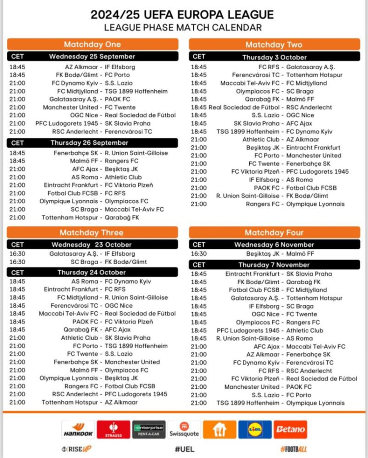 UEFA Avrupa Ligi'nde Türkiye'yi temsil edecek olan Fenerbahçe, Galatasaray ve Beşiktaş'ın fikstürü belli oldu. Galatasaray ilk maçını 25 Eylül'de evinde PAOK ile evinde oynayacak. Beşiktaş 26 Eylül'de Ajax'a konuk olacak. Fenerbahçe ise yine aynı tarihte Union Saint-Gilloise'yi ağırlayacak.