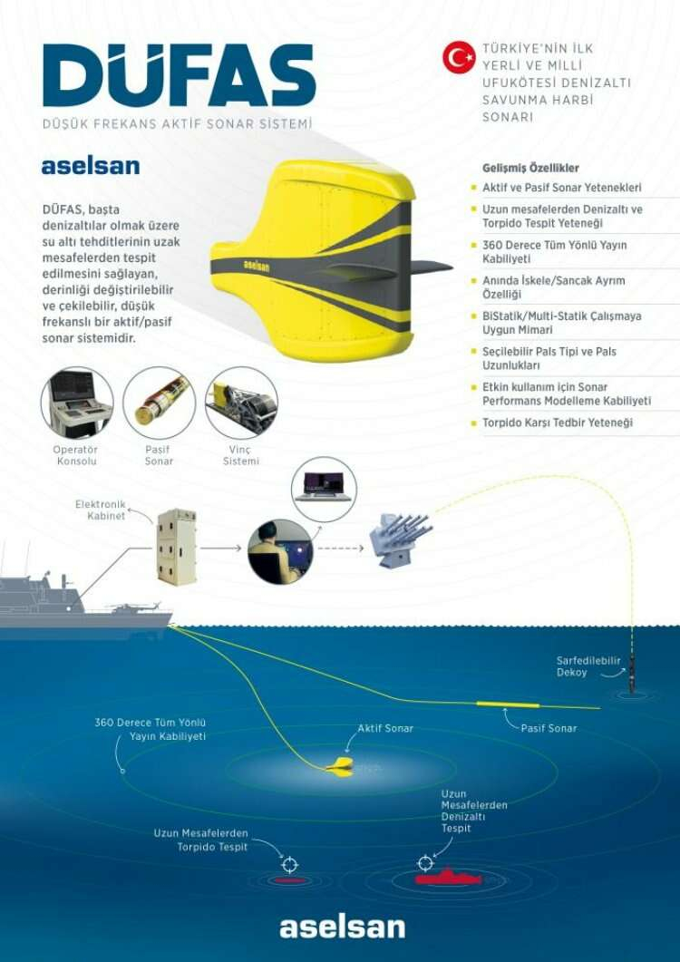 Yurt içi imkanlarla tasarlanıp üretilen ilk ve tek çekili aktif sonar sistemi DÜFAS; akustik sinyalleri aktif sonar bileşenleri aracılığıyla yayınlıyor, yayınlanan sinyalin hedeflerden yansımalarını pasif sonar ile toplayarak su altı taktiksel resmi oluşturuyor, uzun menzilde, yüksek doğrulukta su altındaki tehditlerin tespitini ve takibini sağlıyor.