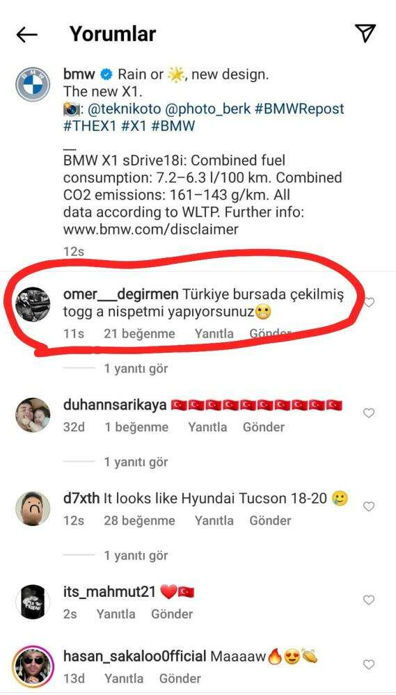 Paylaşımı gören Türk takipçiler ise, “Yoksa siz TOGG’a nispet mi yapıyorsunuz?” şeklinde yorumlar yaptı.