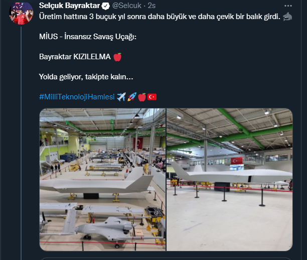 Bayraktar "Üretim hattına 3 buçuk yıl sonra daha büyük ve daha çevik bir balık girdi. MİUS - İnsansız Savaş Uçağı: Bayraktar KIZILELMA. Yolda geliyor, takipte kalın" açıklamasında bulundu.