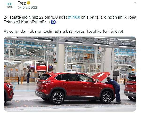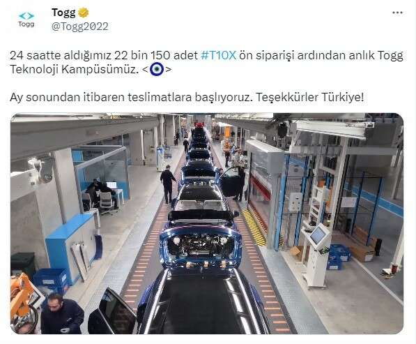Togg'un sosyal medya hesabından yapılan paylaşımda, "24 saatte aldığımız 22 bin 150 adet T10X ön siparişi ardından anlık Togg Teknoloji Kampüsümüz. Ay sonundan itibaren teslimatlara başlıyoruz.