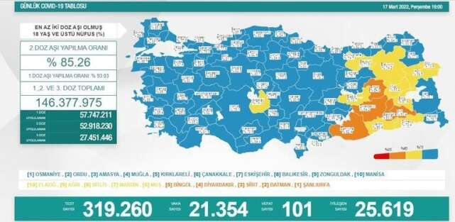 Sağlık Bakanlığı tarafından Türkiye’nin yeni korona virüs tablosu açıklandı. 17 Mart’ta açıklanan 24 saatlik verilere göre, 21 bin 354 vaka tespit edildi. Virüs nedeniyle hayatını kaybedenlerin sayısı 101 oldu. Bir günde toplam 319 bin 260 test yapılırken, iyileşen hasta sayısı 25 bin 619 olarak kaydedildi. Sağlık Bakanlığı tarafından açıklanan tabloda, 2 doz aşılama verilerine de yer verildi. En az 2 doz aşı olmuş 18 yaş üzeri nüfusu kapsayan verilere göre Türkiye’de 2. doz aşılama ortalama yüzde 85,26 oldu. 1. doz ortalaması yüzde 93,03 olurken, 1., 2. ve 3. doz aşısını olan vatandaş sayısı toplamda 146 milyon 377 bin 915’e yükseldi.İLK SIRADA OSMANİYE VAR