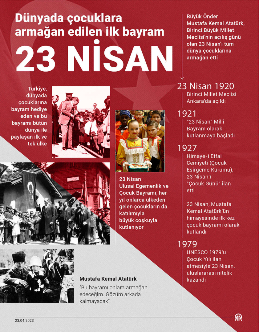 "23 Nisan 1920'de Türkiye Büyük Millet Meclisi açılmıştır. Buhranlı günlerde bağımsızlık sevdasıyla kurulan Türkiye Büyük Millet Meclisi, birlik ve beraberliğimizin sembolü olarak ülkemizin ve milletimizin geleceğe emin adımlarla yürümesine ve bugünlere ulaşmamıza vesile olmuştur. Yüreğinde sevgi, barış, dostluk, kardeşlik duyguları yeşeren yavrularımızla bu anlamlı bayramı dünya çocuklarıyla birlikte dünyanın ilk ve yegane çocuk bayramı olarak kutlamanın sevinç ve mutluluğunu yaşıyoruz."
