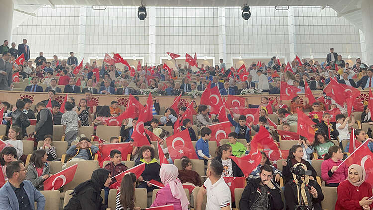 Kutlama programında, Kahramanmaraş merkezli 6 Şubat'taki depremlerden etkilenen illerinin adının yazılı olduğu Türk bayraklı pankartları taşıyan çocuklar gösteri yaptı.