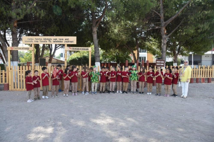 Altıeylül Hatice Fahriye Eğinlioğlu İlkokulu'nun bahçesinde gerçekleştirilen törende öğrenciler, ilk derslerini doğayla iç içe geçirerek toprakla buluştu. Proje kapsamında öğrencilere fidanlar hediye edilerek dikim zamanı gelene kadar bakımını yapmaları teşvik edildi.