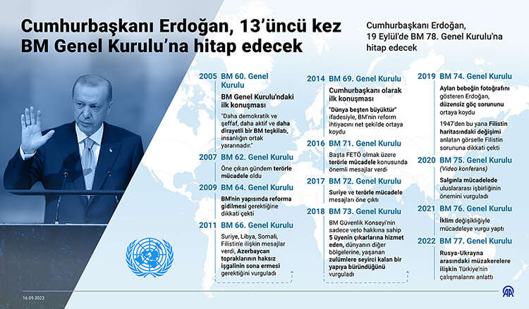 Birleşmiş Milletler (BM) Genel Kurulu'nda bugüne kadar 12 konuşma yapan Cumhurbaşkanı Recep Tayyip Erdoğan, 19 Eylül'de bir kez daha BM kürsüsünden mesajlarını uluslararası kamuoyuyla paylaşacak.