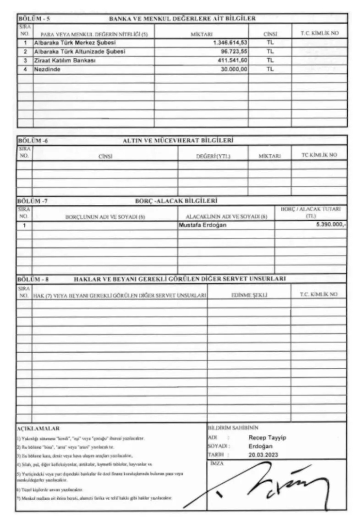 Buna göre Erdoğan’ın iki tanesi Al Baraka Türk, bir tanesi de Ziraat Katılım Bankası ve ‘nezdinde’ başlığıyla toplam 4 ayrı hesapta 1 milyon 883 bin lirası bulunuyor. Mal varlığı tablosunda Mustafa Erdoğan’a ise 5 milyon 390 bin liralık borcu görünüyor.