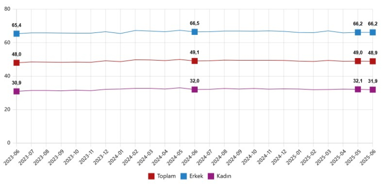 Haziran ayında istihdam edilenlerin haftalık ortalama fiili çalışma süresi de 1,1 saat azalarak 41,5 saate düştü. İşgücüne katılma oranı %53,5 seviyesinde sabit kalırken, erkeklerde bu oran %71,3, kadınlarda ise %36,0 olarak ölçüldü.
