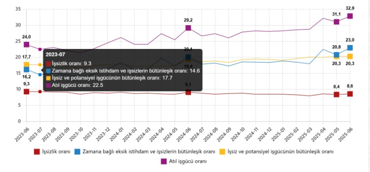 Haziran ayında dikkat çeken bir diğer veri de atıl işgücü oranı oldu. Zamana bağlı eksik istihdam, işsizler ve potansiyel işgücünden oluşan bu oran bir önceki aya göre 1,8 puan artarak %32,9’a yükseldi. Bu durum, her üç kişiden birinin tam kapasiteyle çalışmadığı ya da iş bulamadığını ortaya koyuyor.