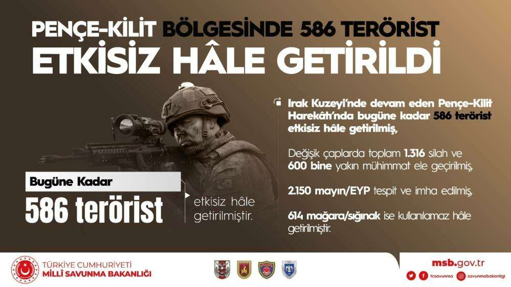 Terörü kaynağında yok etme stratejisinin kararlılıkla uygulandığını belirten Albay Aktürk, “Irak ve Suriye’nin kuzeyi dahil; son bir haftada 53 terörist etkisiz hale getirilmiştir. Böylece etkisiz hale getirilen terörist sayısı bu yıl içinde 995’e, 24 Temmuz 2015’ten bugüne kadar ise 38 bin 338’e ulaşmıştır. Irak Kuzeyi’nde devam eden Pençe-Kilit Harekatı’nda bugüne kadar 586 terörist etkisiz hale getirilmiş, değişik çaplarda toplam bin 316 silah ve 600 bine yakın (585 bin 563) mühimmat ele geçirilmiş, 2 bin 150 mayın/EYP tespit ve imha edilmiş, 614 mağara/sığınak ise kullanılamaz hale getirilmiştir” diye konuştu.