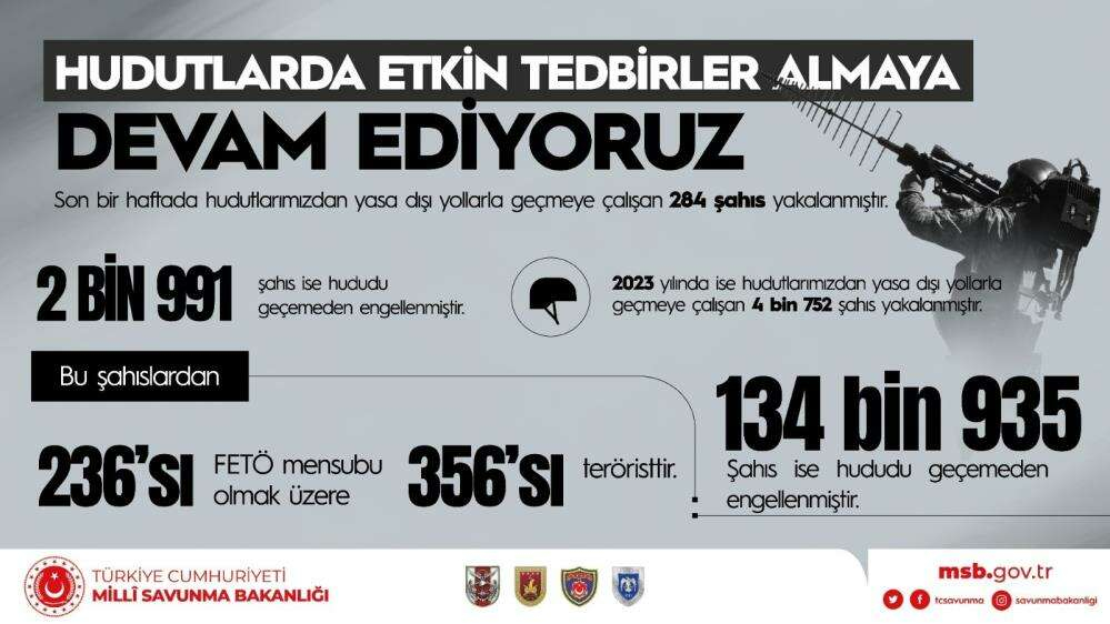 Sınır güvenliği ile ilgili açıklamalarda bulunan Albay Aktürk, hudut hattında ilave tedbirler alındığını hatırlatarak, “Sınırlarımızın ve halkımızın güvenliği için hudutlarımızda alınan ilave ve etkin tedbirler sayesinde; Son bir haftada hudutlarımızdan yasa dışı yollarla geçmeye çalışan 284 şahıs yakalanmıştır. Bu şahıslardan 9’u teröristtir. 2 bin 991 şahıs ise hududu geçemeden engellenmiştir. 2023 yılında ise hudutlarımızdan yasa dışı yollarla geçmeye çalışan 4 bin 752 şahıs yakalanmıştır. Bu şahıslardan 236’sı FETÖ mensubu olmak üzere 356’sı teröristtir. 134 bin 935 şahıs ise hududu geçemeden engellenmiştir. Ayrıca, son bir haftada icra edilen operasyonlarda 172 kilogram uyuşturucu ve 860 adet hap ele geçirilmiştir. Yılbaşından bu yana icra edilen operasyonlarda ise toplam 4 bin 803 kg uyuşturucu ve bin 911 adet hap ele geçirilmiştir” açıklamasında bulundu.