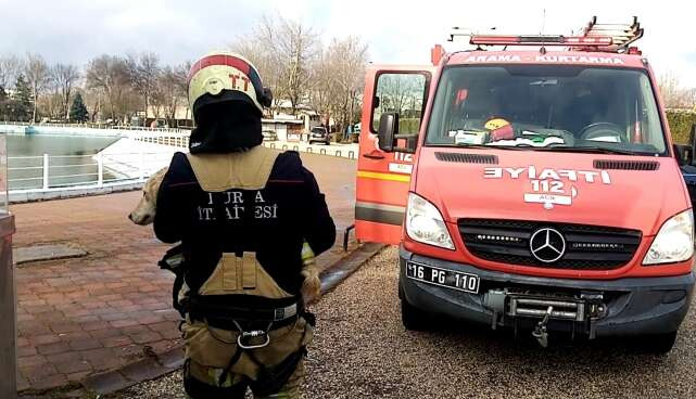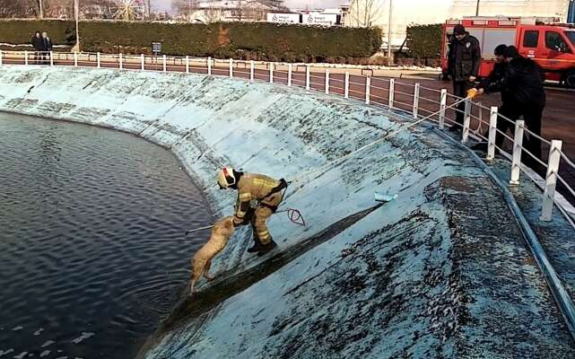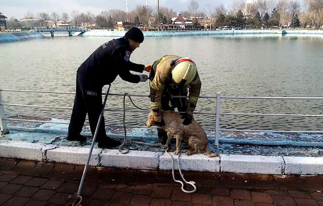Hikmet Şahin Kültür Parkı'nda gölete düşen köpeği görenler, itfaiyeye haber verdi. Parka gelen ekipler, gölet içinde çırpınan köpeği çıkarmak için çalışma başlattı. İtfaiye eri Tuncay Turan, önce halatla göle indi daha sonra bağladığı köpeği soğuk sudan çıkardı.