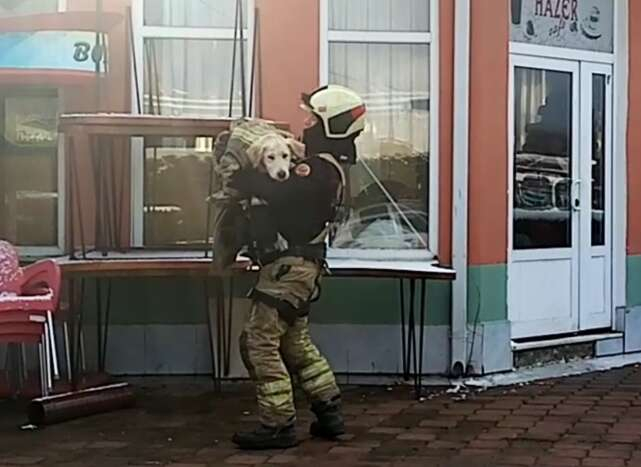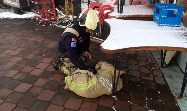 Bursa'nın İnegöl ilçesi Hikmet Şahin Kültür Parkı'ndaki gölete düşen köpek itfaiye tarafından kurtarıldı. İtfaiye erinin donmak üzere olan köpeği montuyla ısıtması yüzleri güldürdü.