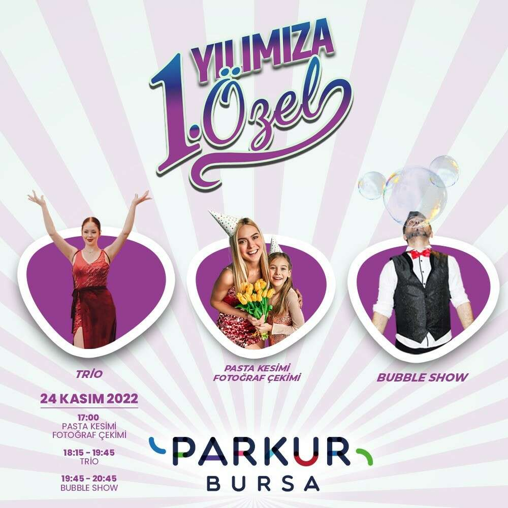 Bursa'nın yeni nesil eğlence, yaşam ve alışveriş merkezi Parkur AVM, birinci yıl coşkusuna ortak olan misafirler sürpriz dolu anlara da şahit oluyor. Türkiye'nin en gelişmiş oyun eğlence merkezi Zeplinx'i bünyesinde barındıran Parkur AVM, çocukların vazgeçilmezi olurken, 24 Kasım 2022 Perşembe günü 18:15-19:45 saatlerinde Trio, 19:45-20:45’de ise Bubble Show ile ailelerde eğlence dolu anlar yaşayacak.
