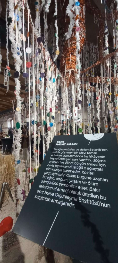 Onlarca rengarenk düğmeden oluşan bu ağacın kökleri ve dalları Selanik’ten İznik’e göç eden bir aileyi temsil ediyor. Aynı zamanda hikâyenin baş rolünde yer alan Nazif’in düğme oyunundan döndüğü gün annesi için ceviz toplarken düştüğü ağaçtaki kazayı işaret ediyor. Doğumu, yaşamı ve ölümü sembolize ediyor. Bakır tellerden el emeği olarak üretilen ağaç Bursa Olgunlaşma Enstitüsü’nün sergiye hediyesi!