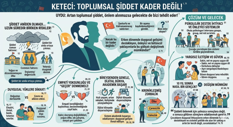 Artan toplumsal şiddetin önlem alınmazsa gelecekte de bizi tehdit edeceğini vurgulayan Klinik Psikolog Emir Keteci, “Ancak bu bir kader değildir. Erken dönemde duygusal gelişimi destekleyen, önleyici ve bütüncül yaklaşımlarla bu gidişatı değiştirmek mümkündür!” dedi.