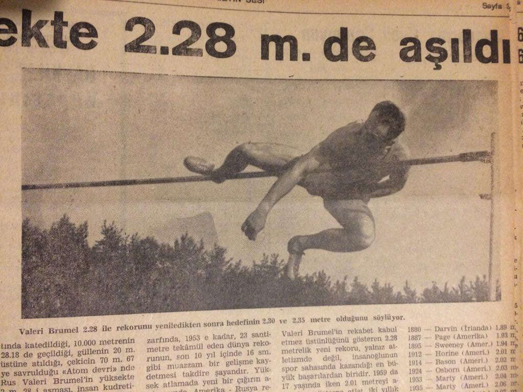 Yüksek atlamanın unutulmaz ismi, binme tekniği ile 2.28 metre atlayan ünlü Rus atleti Valeri Brumel’in, A.B.D. Stanford Üniversitesi salonunda antrenman yaparken çekilmiş muhteşem bir resmi. Potaya değil, çembere değiyor. Konu ile ilgili olarak 1960’lı yıllarda binme tekniği ile atlayan 3 başarılı isim, Prof.Dr.Ersin İstanbulluoğlu, Merdol Gerçin ve Babür Kerim İncedayı’dan görüş istedim. Üçü de bu resmin gerçek olduğunu doğruladı.