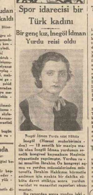 (İnegöl İdman Yurdu- 1935 Türkiye'nin ilk kadın spor kulübü başkanı Vahide Hanım (Kaynak: İnegöl Kent Müzesi)