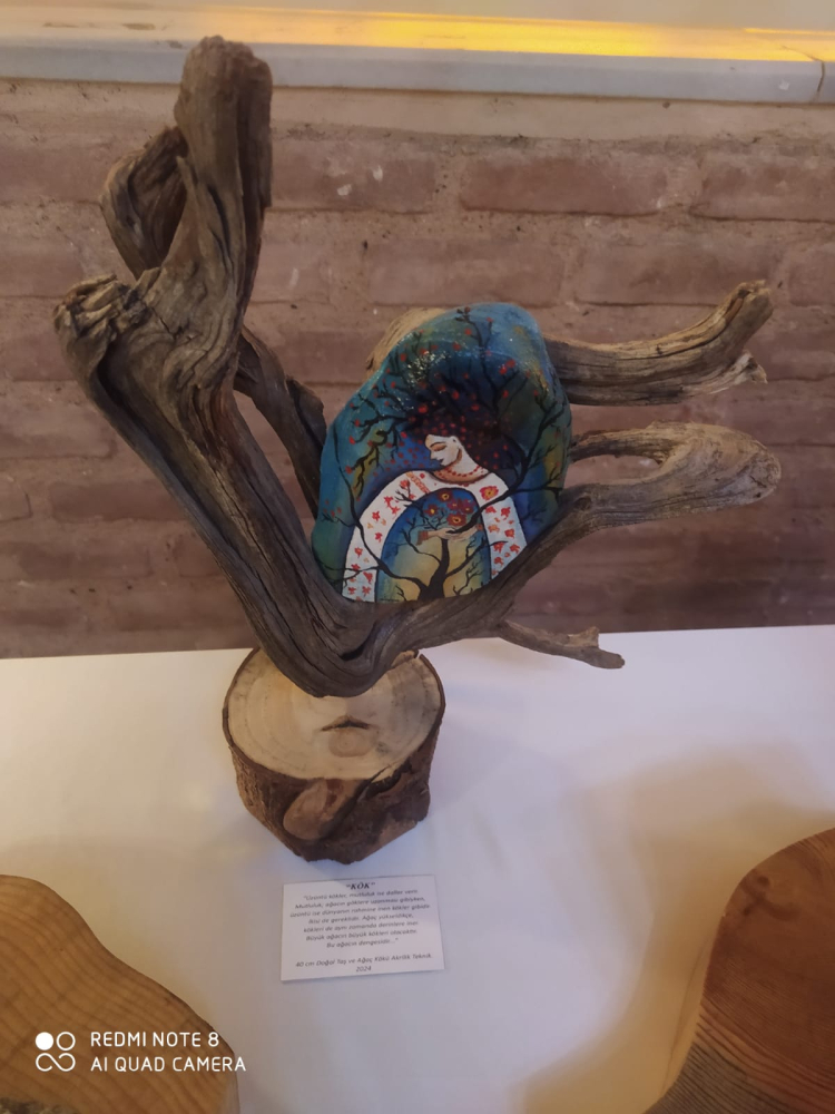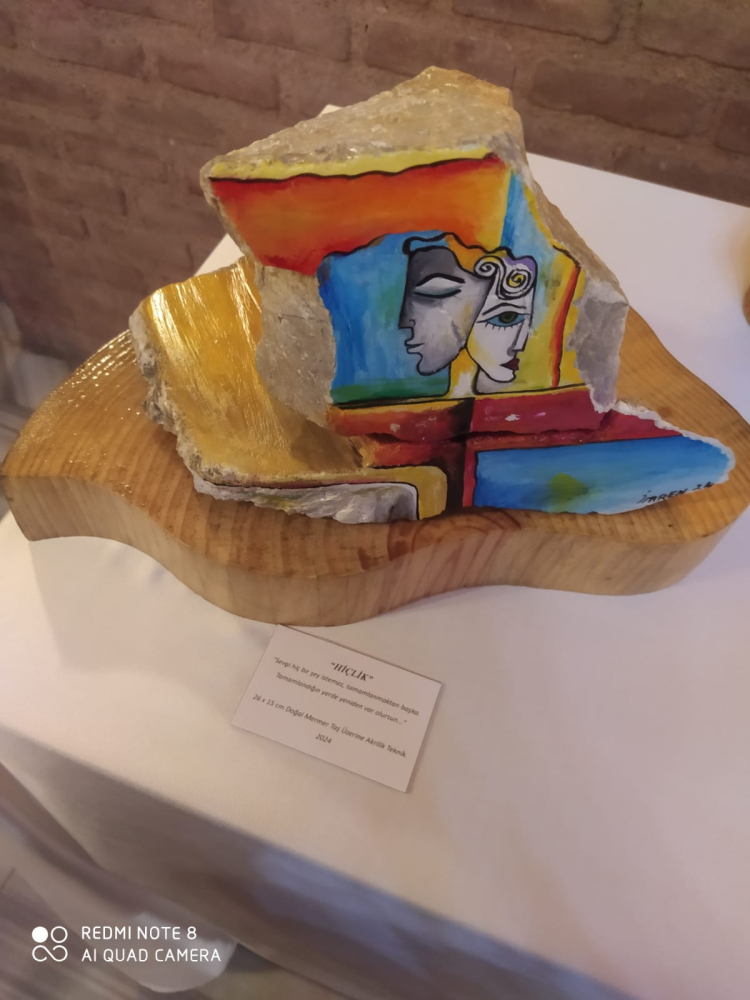 Taşları hayal gücüyle resmeden, boyaları tıpkı bir şiir dizeleri gibi kullanan sanatçımız, bunları ahşap ürünlerle birleştirmiş. İki birleşimden ortaya çıkanları gördüğümde büyük bir hayranlıkla izlemeden kendimi alamadım.