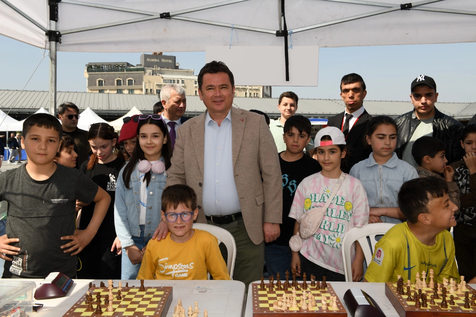 Başkan Aydın, çocuklarla birlikte bol bol fotoğraf çektirerek meydandaki şenlik alanını gezdi.