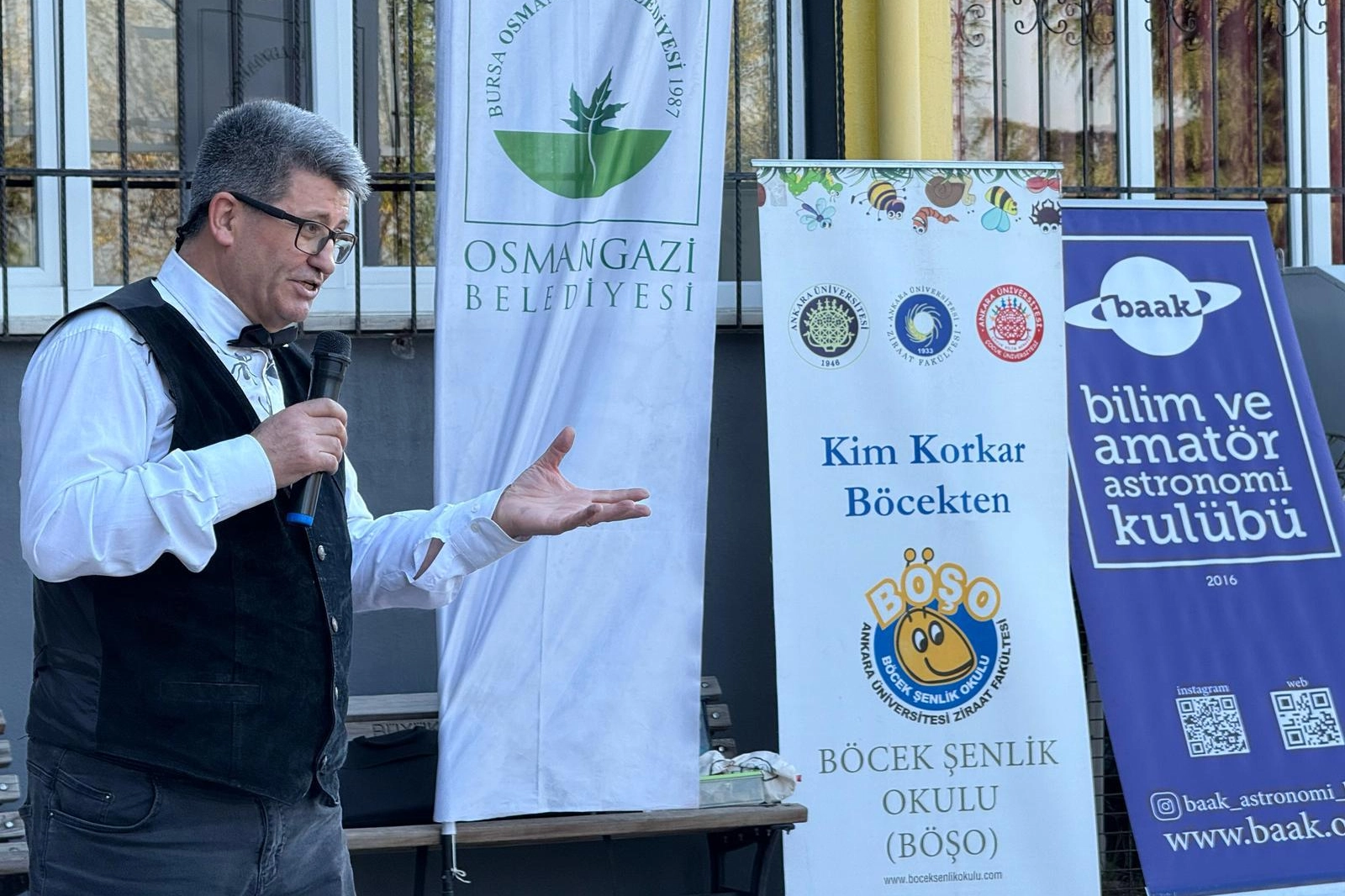 Bilim ve Amatör Astronomi Kulübü (BAAK) Derneği yönetimi üyesi Canan Bilgi’nin moderatörlüğünü yaptığı “Osmangazi Bilim Buluşmaları” etkinliği, Büyük Önder Mustafa Kemal Atatürk ve aziz şehitlerimiz anısına yapılan saygı duruşu ve İstiklal Marşı’nın okunmasıyla başladı. Etkinliğe katılan Ankara Üniversitesi Böcek Bilimci Prof. Dr. Cem Özkan, bilgisi, heyecanı ve performansı ile katılımcılara eğlenceli bir öğrenme ortamı sundu. Yapılması planlanan teleskopla gökyüzü gözlemi, hava muhalefeti nedeniyle gerçekleştirilemedi.